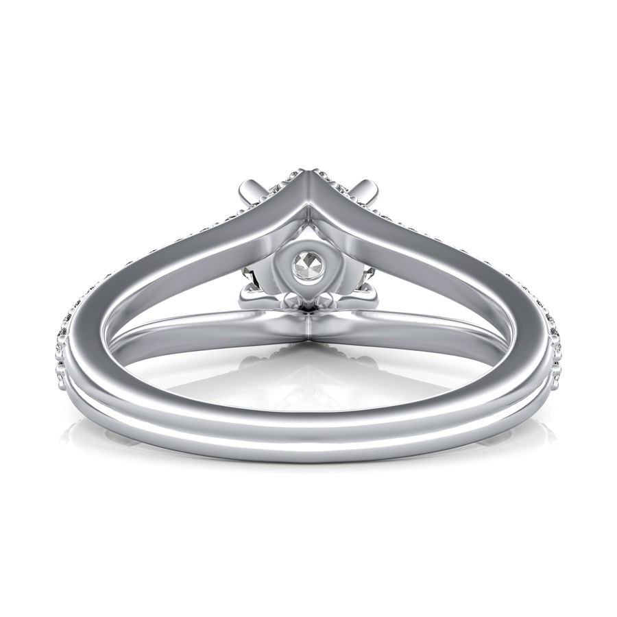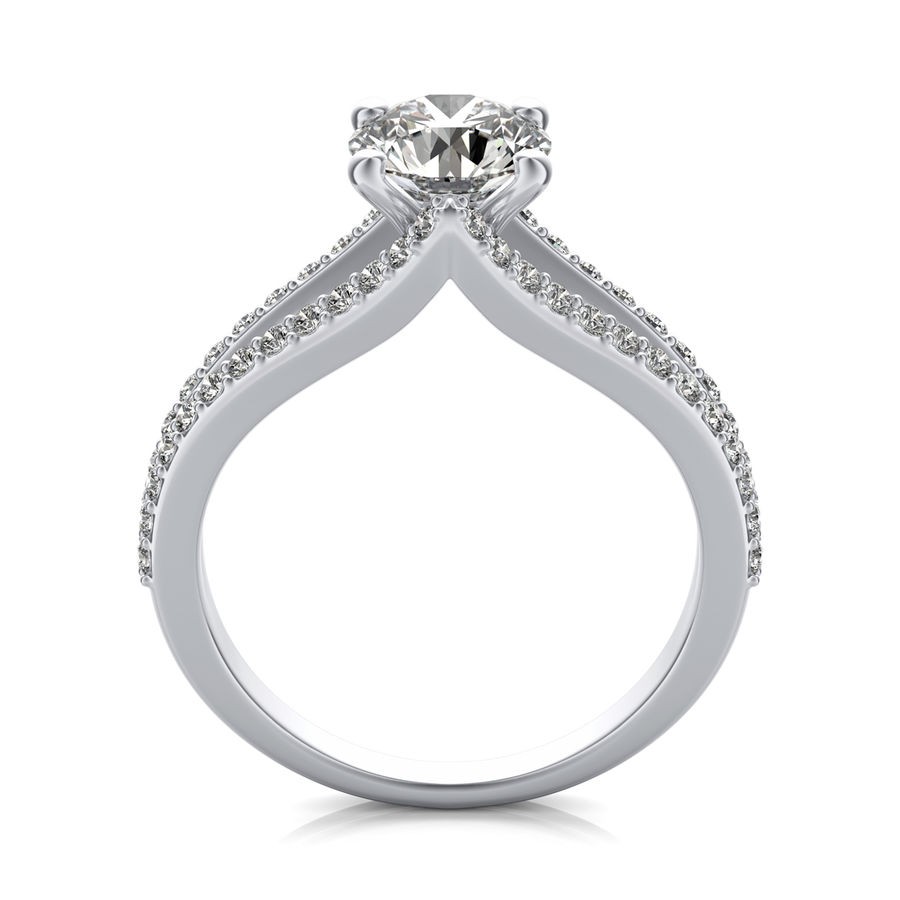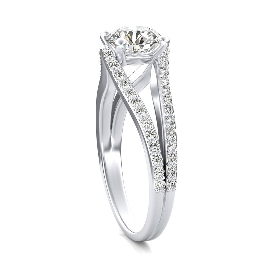 DetailsSplit shank pave set engagement ring. This ring has a 1.00 ct total diamond weight. We have a 100% natural diamond guarantee and the diamonds on this ring are certified at D, VVS1. The center stone shape is “Round” and the diamond has 0.65 ct. The side stones shape are Round and have 0.35 ct total diamond weight. This ring is hand crafted in the USA in 14k White Gold. For more information, call us today.